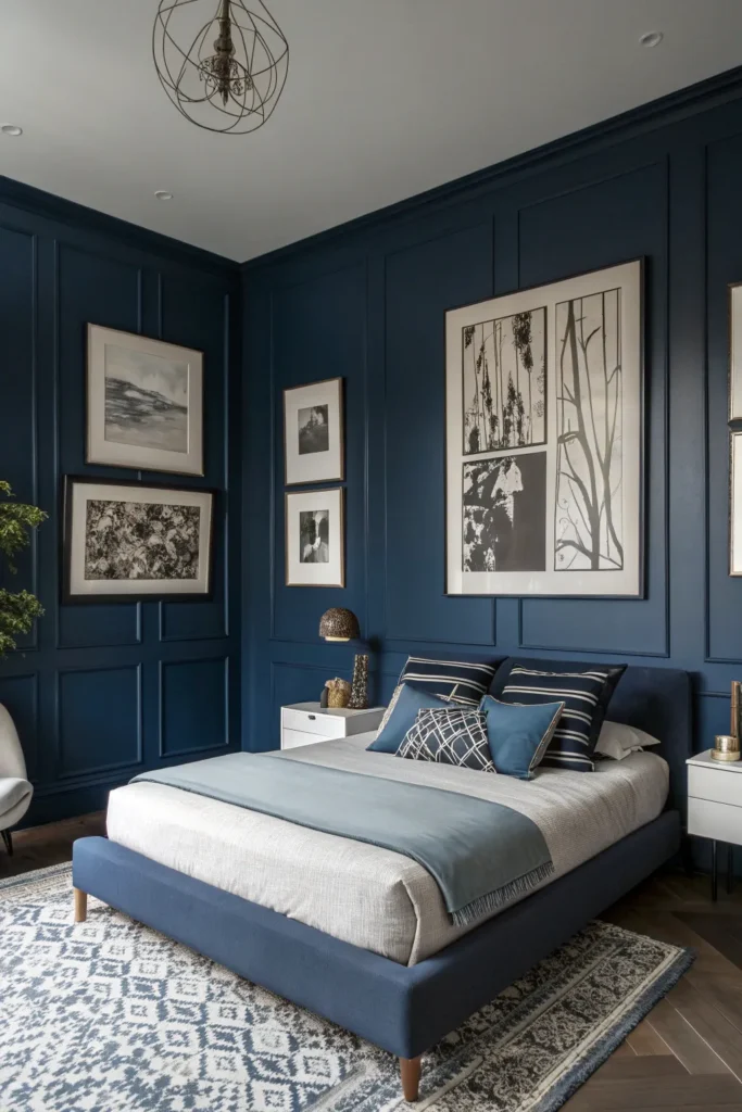 Modern art can completely change the feel of a dark blue bedroom. Abstract paintings, monochrome photography, or graphic prints stand out beautifully against deep blue walls. Choose artwork with light or neutral tones to create contrast, or subtle blues to maintain harmony. Keep frames simple and modern to enhance the overall aesthetic.