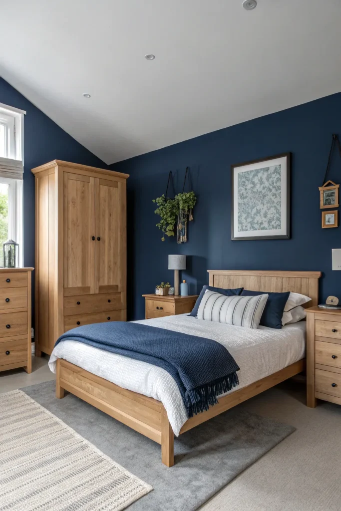 Combining dark blue walls with light wood furniture creates a modern, Scandinavian-inspired contrast. The deep blue adds drama, while pale oak or ash tones bring warmth and balance. This combination works well in both large and small bedrooms, making the space feel grounded but not heavy. Keep lines simple and furniture low-profile to maintain a modern feel.