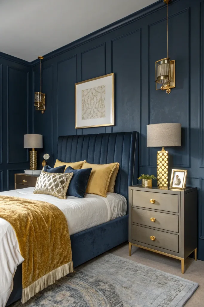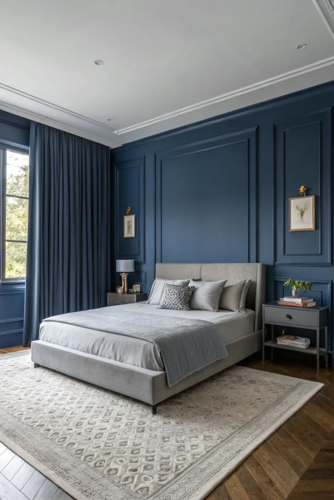 Dark blue pairs effortlessly with soft gray, making it ideal for a modern bedroom that feels calm and refined. Use dark blue on walls or textiles, and layer in light gray bedding, rugs, or curtains. This palette feels particularly modern because it avoids high contrast while still offering visual interest. Metallic accents in brushed nickel or matte black complete the look.