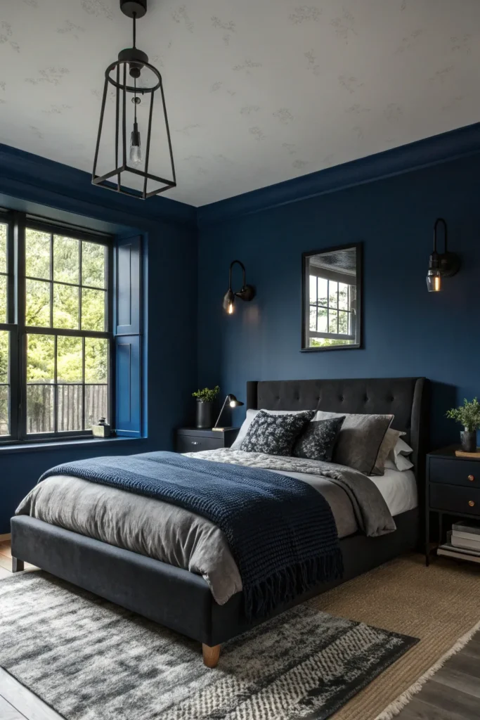 For a bold, contemporary look, combine dark blue with black accents. Think black bed frames, lighting fixtures, or window frames against deep blue walls. This approach leans into modern luxury and works best with good lighting and thoughtful textures. Add softness through plush bedding or a textured rug to prevent the space from feeling too stark.
