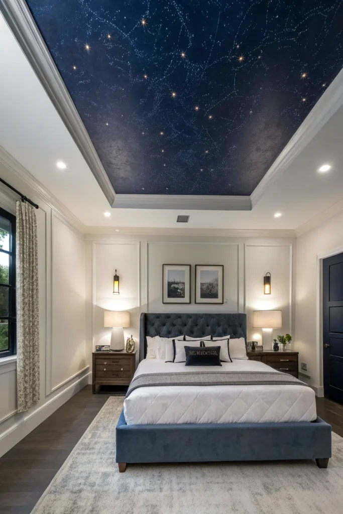 Instead of painting the walls, consider a dark blue ceiling. This unexpected design choice feels fresh and modern while adding intimacy to the bedroom. It works especially well in rooms with white or light-colored walls. A dark blue ceiling can visually lower high ceilings, making the space feel cozier without compromising elegance.