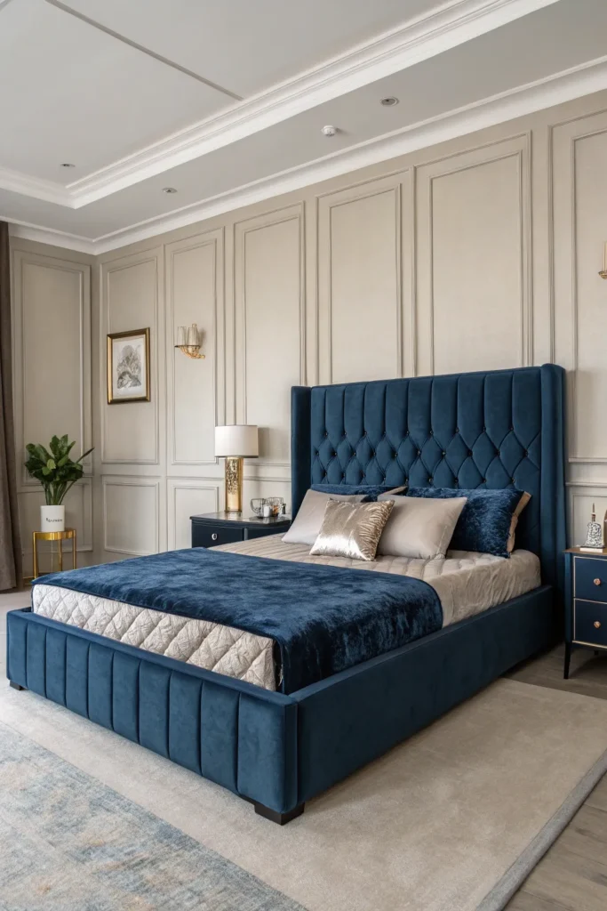 If painting walls feels like too much commitment, a dark blue upholstered bed is a modern alternative. Velvet or linen fabrics in deep blue instantly elevate the bedroom and create a luxurious focal point. Pair it with neutral walls and simple bedside tables to keep the look current and balanced.
