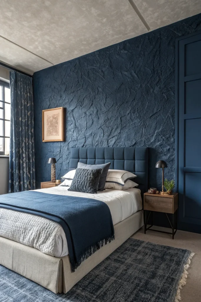 Texture is a major trend in modern design, and dark blue walls are the perfect canvas for it. Consider limewash paint, textured wallpaper, or fabric wall panels in deep blue tones. These textures add depth and movement, preventing the color from feeling flat. Keep furniture and décor simple to let the walls stand out.