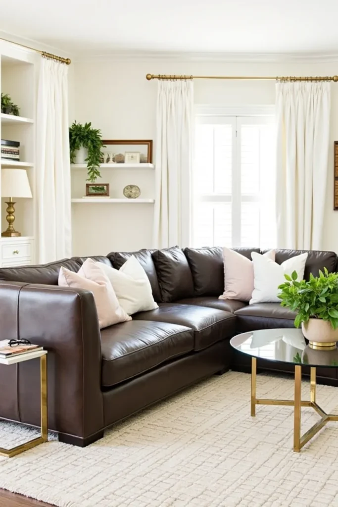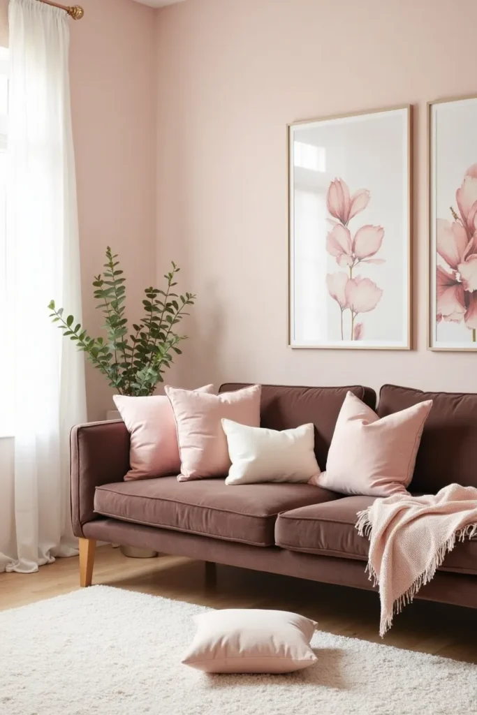 Create an unexpectedly romantic and sophisticated living room by pairing your dark brown couch with soft pink or blush walls and rose gold accessories, developing a palette that feels both feminine and grounded. Add floral elements through fresh flowers, botanical artwork, and nature-inspired accessories.