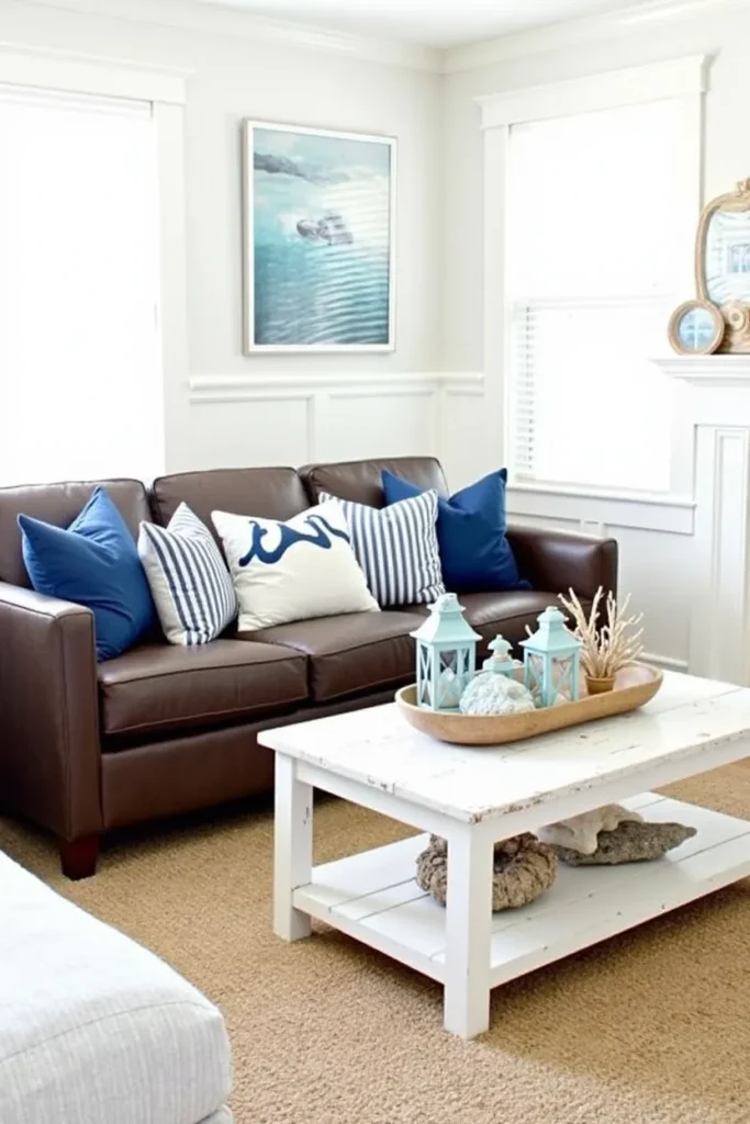 Create a relaxed coastal atmosphere by surrounding your dark brown couch with crisp white walls, navy blue accent pieces, and weathered wood furniture that evokes seaside living. Add coastal-themed accessories including rope details, driftwood elements, and sea glass colors throughout the space.