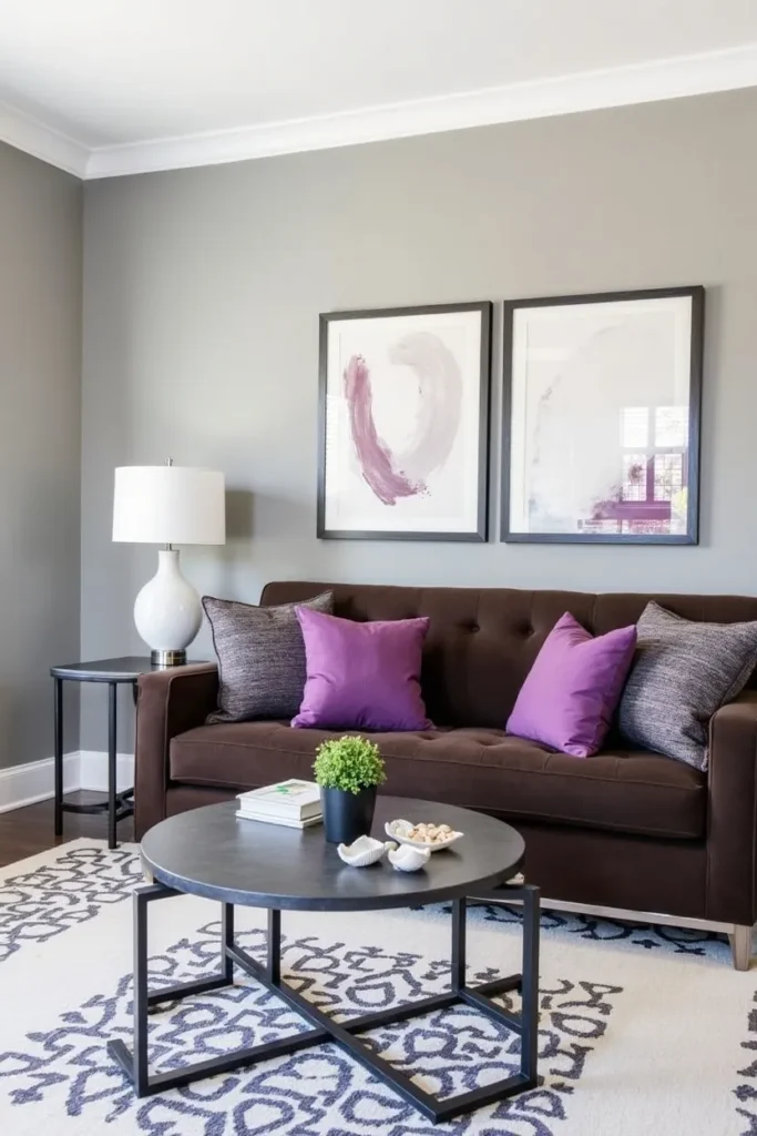 Design a modern, sophisticated living room by pairing your dark brown couch with walls in soft gray and accent pieces in rich purple tones, creating an unexpected color combination that feels both contemporary and timeless. Add metallic accessories in silver or pewter finishes for additional sophistication.