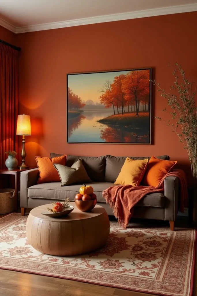 Install warm lighting with amber-toned bulbs, position wooden furniture with rich finishes, and include artwork featuring autumn landscapes or warm abstract compositions. Layer the space with textiles in warm earth tones, add a patterned area rug featuring the room’s color palette, and complete with accessories like copper vessels, wooden bowls, and seasonal botanicals that enhance the cozy, seasonal atmosphere.