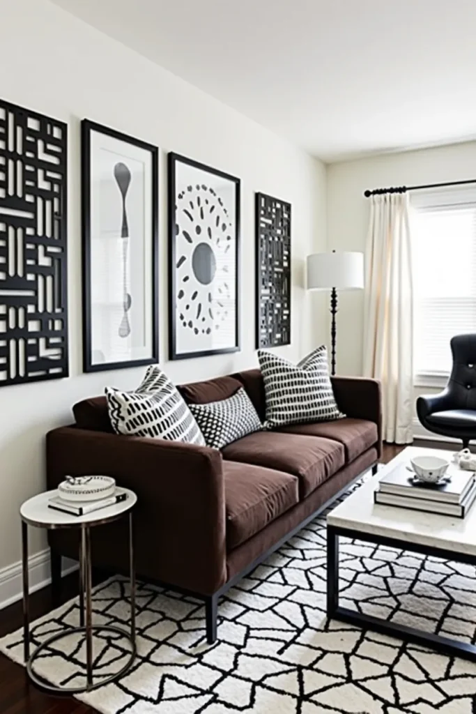 Design a striking contemporary living room by pairing your dark brown couch with bold black and white elements including graphic artwork, geometric patterns, and high-contrast accessories that create visual drama while letting the couch serve as a warming element in the stark palette.