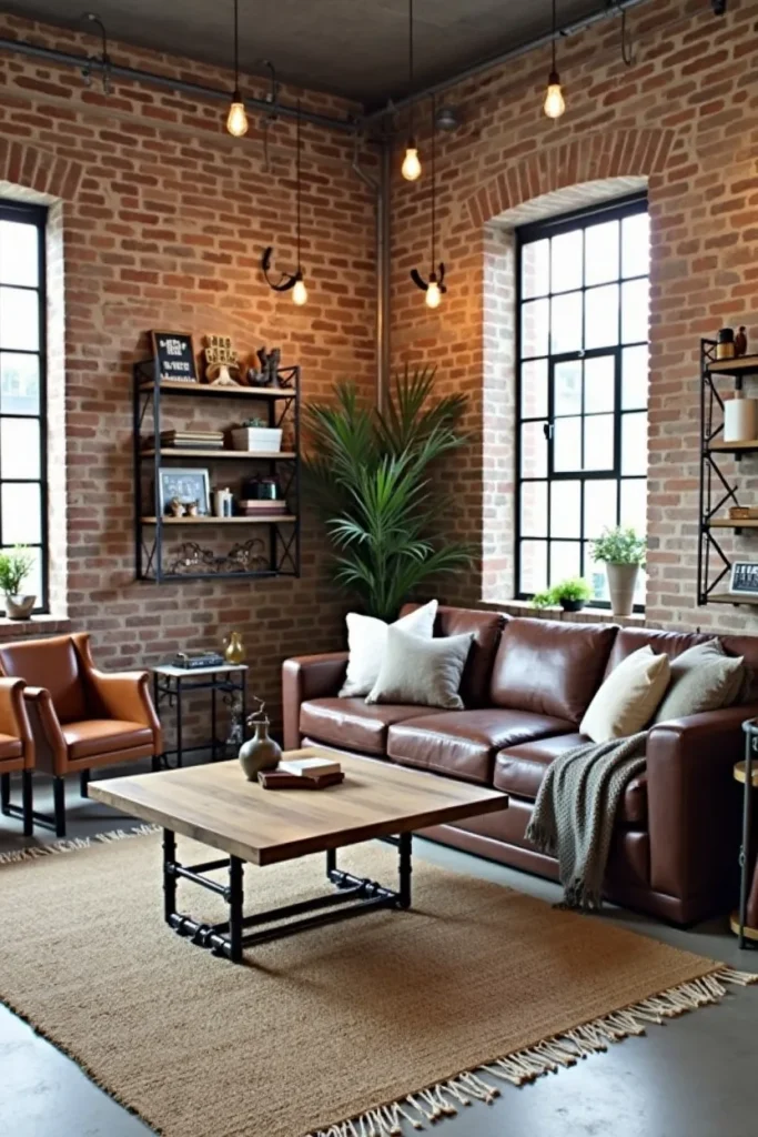 Install track lighting with Edison bulbs to cast warm pools of light throughout the space, add vintage leather chairs in coordinating brown tones, and include industrial accessories like metal sculptures and vintage factory signs. Layer the space with raw textiles including jute rugs, canvas pillows, and wool throws in neutral tones that soften the hard edges while maintaining the urban aesthetic.
