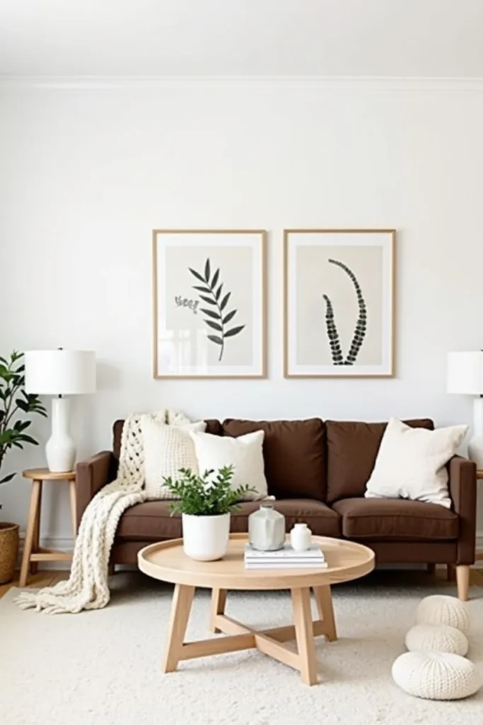 Create a clean, serene environment by surrounding your dark brown couch with light wood furniture pieces including blonde oak coffee tables, birch floating shelves, and pine accent chairs that provide beautiful contrast against the rich upholstery. Keep walls white or soft gray for maximum brightness.
