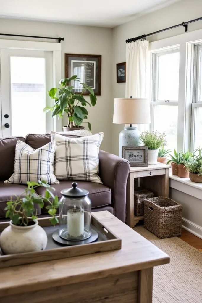 Install vintage-style pendant lighting with metal shades, position distressed wood side tables, and include farmhouse accessories like galvanized metal containers, vintage mason jars, and weathered wooden signs. Add natural elements through potted herbs, wildflower arrangements, and woven baskets that enhance the authentic rural atmosphere while keeping the space comfortable for modern living.