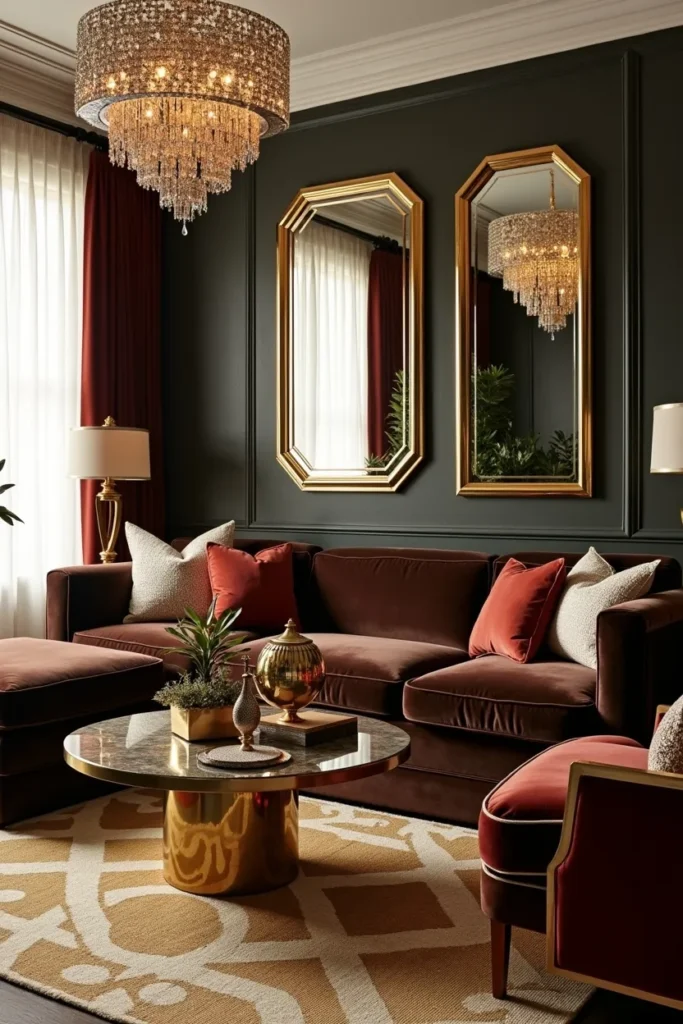 Install a statement chandelier with geometric crystal elements, position brass-framed mirrors and artwork, and include furniture with curved lines and rich veneers. Layer the couch with silk and velvet pillows in jewel tones, add a geometric area rug in gold and brown tones, and complete with decorative objects in brass, glass, and mother-of-pearl that enhance the sophisticated, theatrical atmosphere.