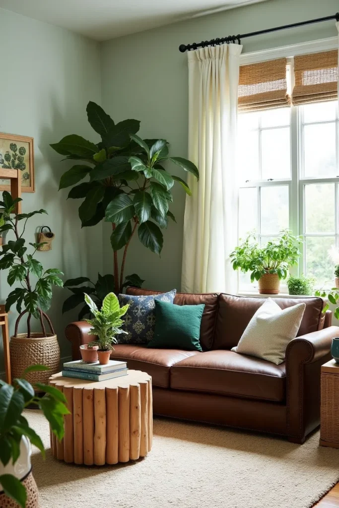 Transform your living room into a lush indoor garden by surrounding your dark brown couch with an abundance of plants in varying sizes and heights, creating a natural oasis that makes the rich upholstery feel like part of an organic landscape. Include large floor plants, hanging planters, and tabletop arrangements.