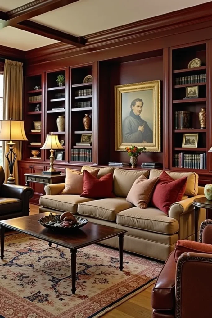 Install traditional table lamps with fabric shades, position leather-bound books and classic accessories throughout built-in shelving, and include artwork in gold frames featuring traditional subjects. Layer the space with rich fabrics in deep colors, add a wool area rug with traditional patterns, and complete with accessories in brass, leather, and crystal that enhance the refined, scholarly atmosphere.