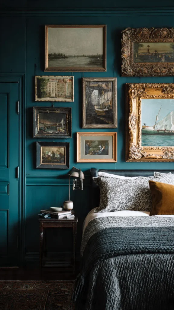 10. Dark Teal Wall with Vintage Frames and Art