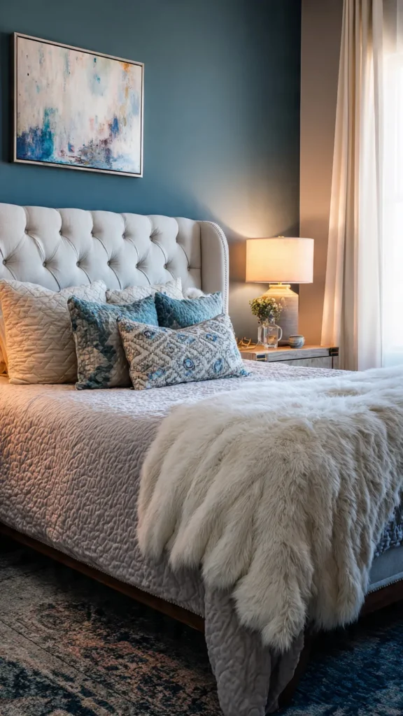 A light upholstered headboard stands out beautifully against a dark teal wall, creating a soft and elegant contrast. Cream, beige, or pale gray fabrics brighten the space and prevent the dark color from feeling too heavy, keeping the bedroom balanced and inviting.