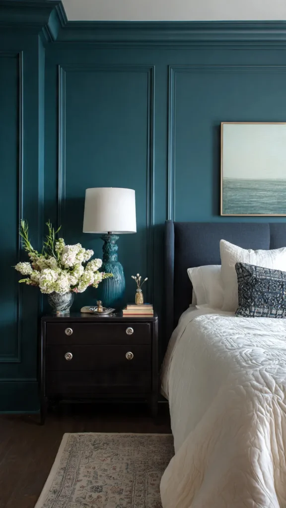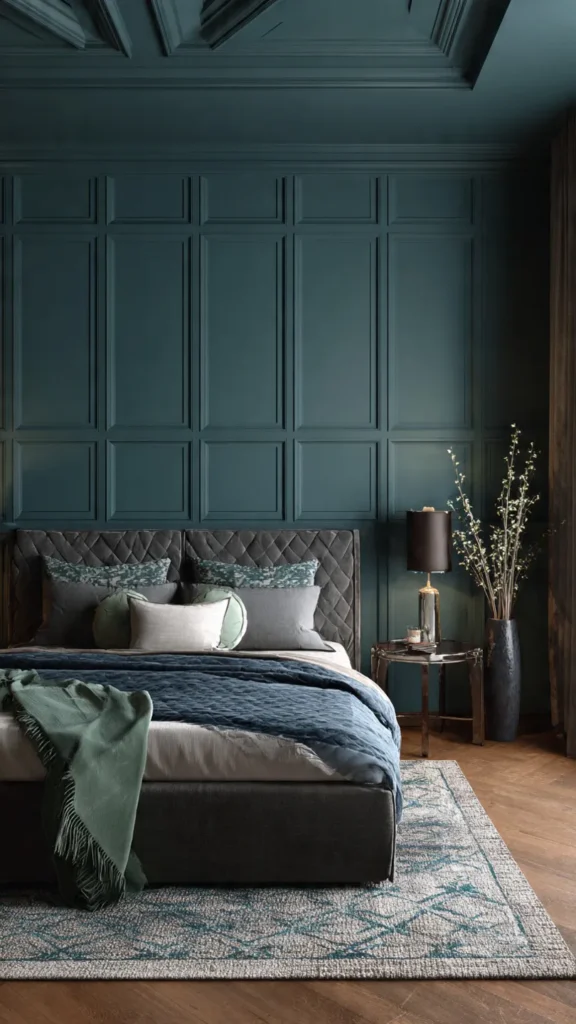 Paneled dark teal walls work beautifully in both modern and traditional spaces. In a classic bedroom, they add elegance and refinement, while in modern interiors they create structure and sophistication. Painting the paneling the same teal shade keeps the look cohesive and prevents visual clutter, allowing the texture to quietly elevate the space while maintaining a calm, restful atmosphere.
