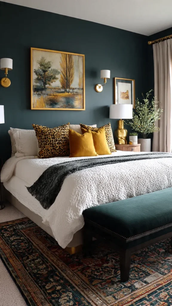 A full dark teal accent wall behind the bed creates a dramatic focal point that anchors the entire room. It frames the sleeping area and gives the bed a sense of importance and presence, making the space feel designed rather than simply arranged.