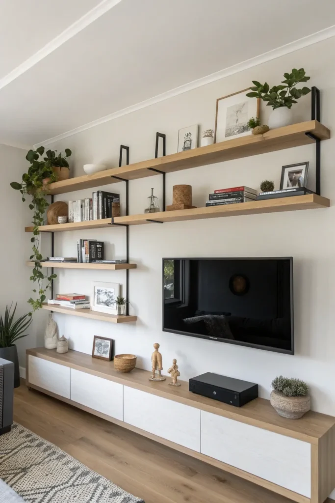 Floating shelves offer both practicality and style, giving you the chance to display curated items while keeping a clean, modern look. They frame the TV naturally, making the wall feel purposeful rather than blank. By layering books, vases, and small decorative objects, you add depth and texture to the entire wall.