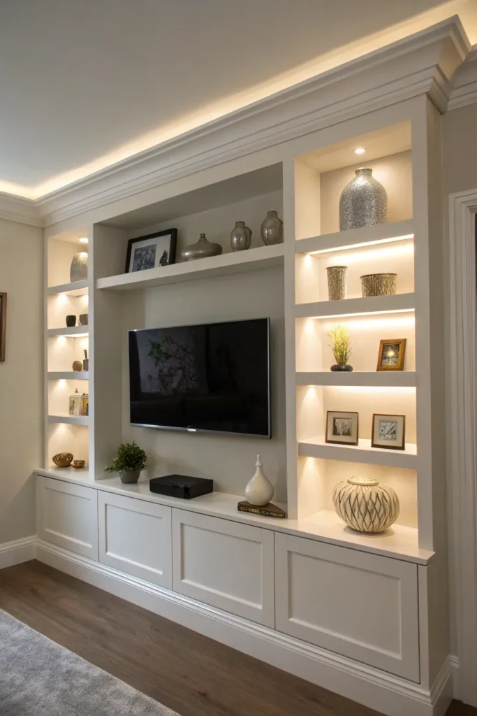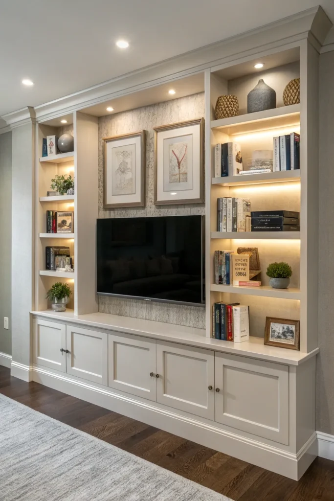 Recessed niches above the TV create a sleek, built-in effect that feels both practical and stylish. These niches keep décor flush with the wall, perfect for modern homes.
