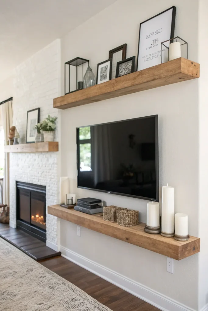 A floating mantel shelf provides structure above the TV while giving you space for seasonal or rotating décor. Its simplicity makes it versatile across design styles.