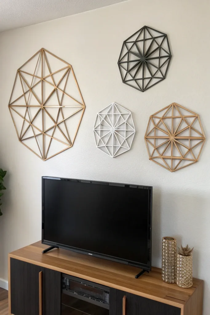Sculptural wall art adds depth and personality to the TV wall. This modern approach creates dimension while maintaining clean lines.