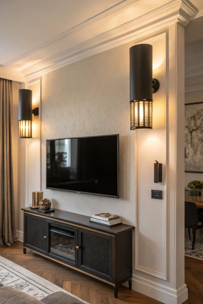 Opt for slim, modern fixtures in black, brass, or chrome finishes. Place them high enough so they frame the TV without drawing too much attention.
