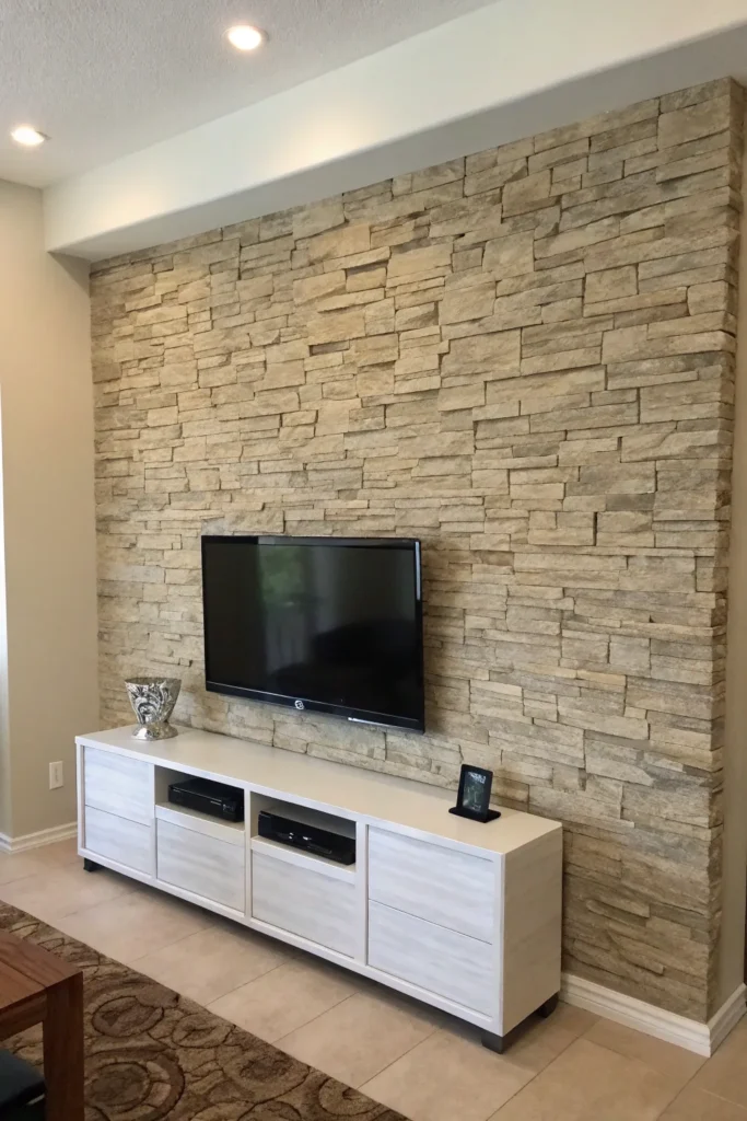 Adding a textured surface above the TV transforms the wall into an architectural feature. Textured stone, wood cladding, or 3D panels create depth and sophistication.