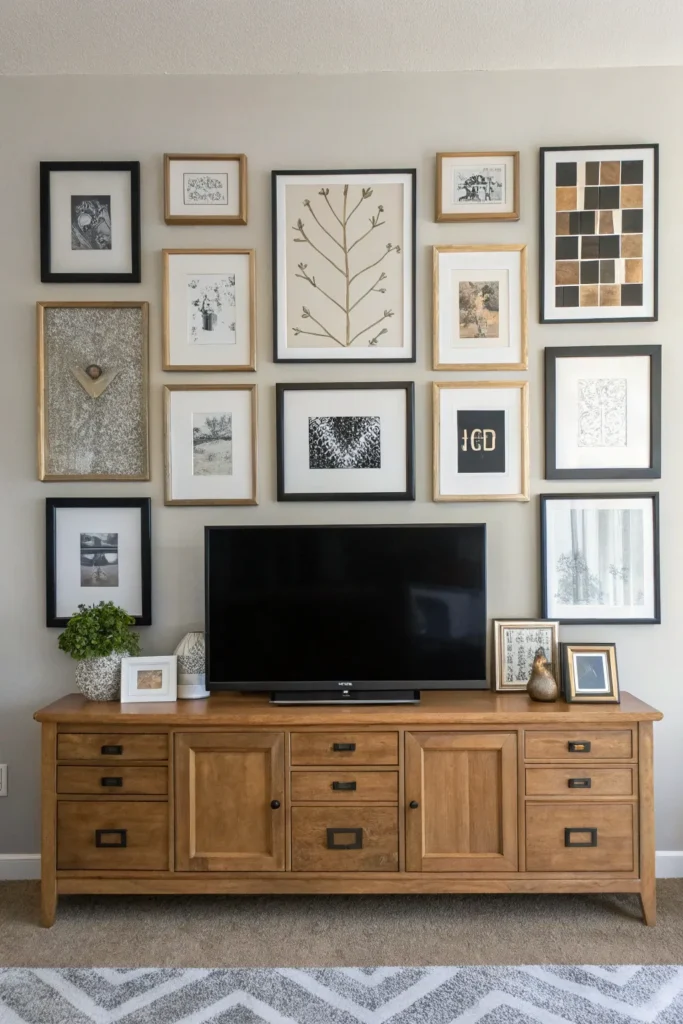 A gallery wall above and around your TV helps integrate the screen into a broader design statement. Instead of the TV being the only focal point, it becomes part of a larger artistic arrangement. Using a balanced set of frames creates visual interest without overwhelming the space.