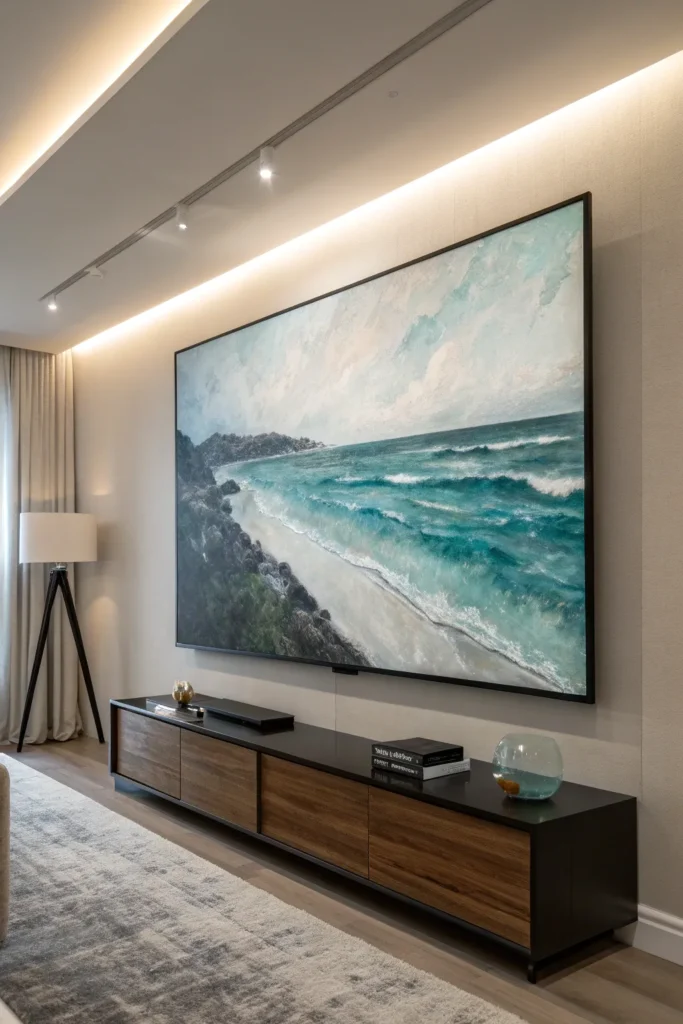 Opt for abstract art in calming tones to keep the look refined, or go bold with vibrant colors if you want to contrast with neutral furniture. The key is proportion—choose artwork that spans at least the width of the TV for harmony.
