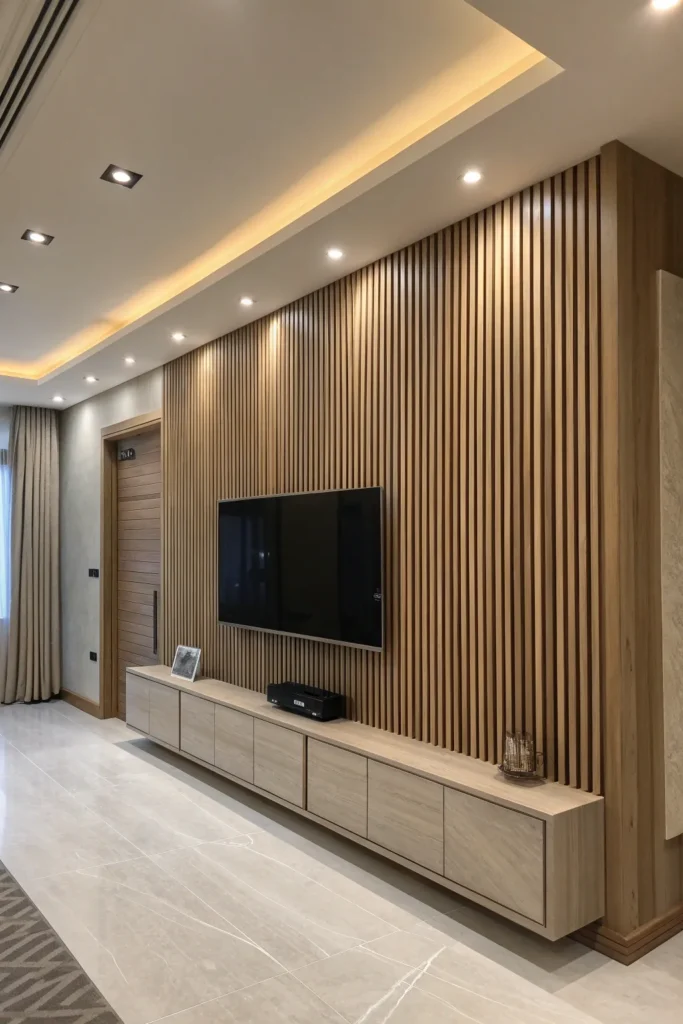 Adding architectural paneling above the TV introduces structure and texture that instantly elevates the room. Vertical or slatted designs create height and rhythm, making the wall a focal point beyond just the screen.