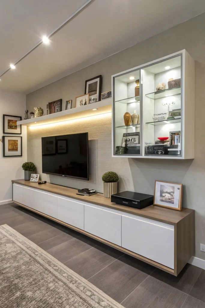 Use closed cabinets for electronics or small items and open niches for decorative displays. This layered mix ensures the wall feels intentional while remaining practical.