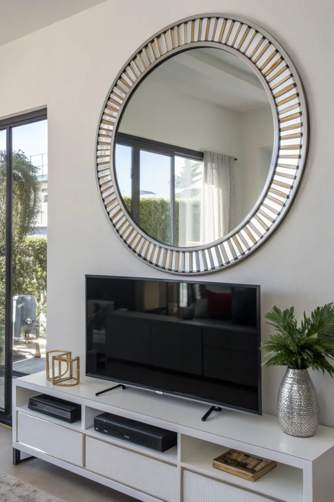 Choose a geometric or round mirror to create contrast against the rectangular TV shape. Keep surrounding décor minimal to maintain focus on the sleek reflection.