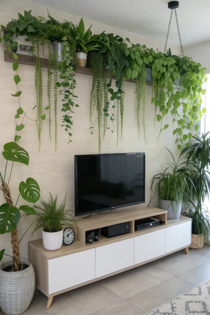 Greenery adds freshness and warmth to a TV wall, softening the sharp edges of electronics. Plants above the TV create a balanced mix of natural and modern design.
