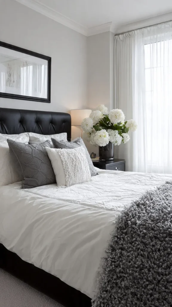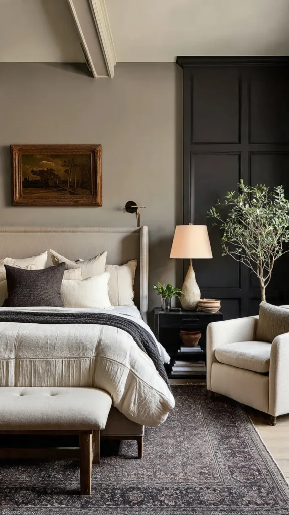 Taupe bedding or walls add depth without overpowering black. The combination feels calm and cohesive. It works especially well in minimalist spaces.