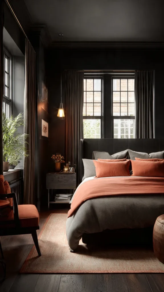 Terracotta adds richness and warmth to black bedrooms. Designers use this earthy tone to counteract black’s coolness. The pairing feels grounded and expressive.