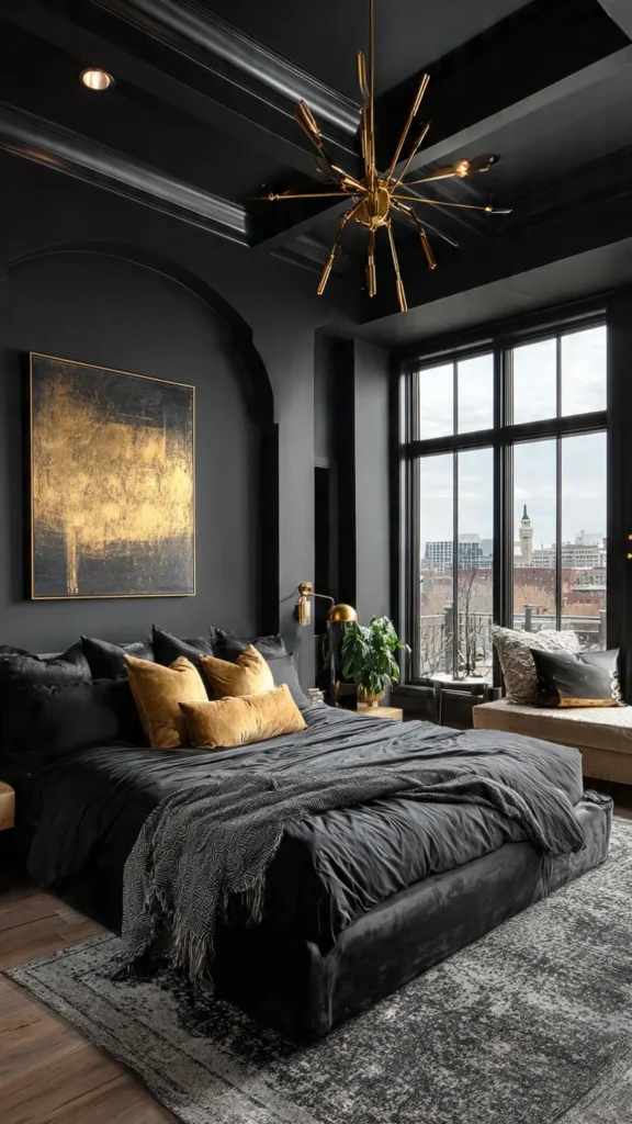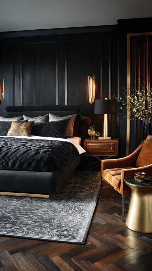 Gold accents instantly elevate black bedrooms. Designers rely on gold for its ability to add warmth and glamour. The contrast feels rich and intentional.