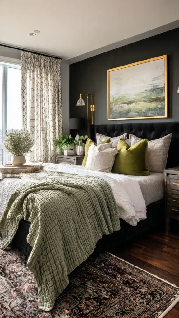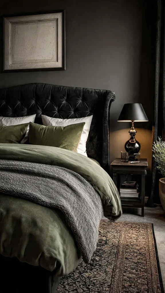 Olive green introduces an earthy, grounding quality to black bedrooms. Designers favor olive for its muted, natural tone. It blends seamlessly with dark palettes.