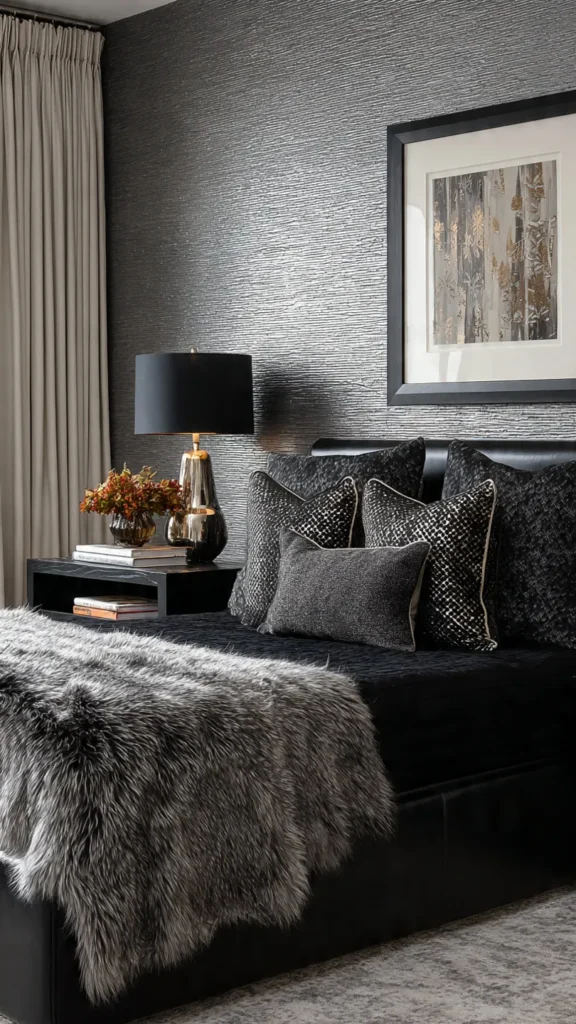 Textured gray adds dimension without adding color. Designers use texture to keep black bedrooms visually engaging. This approach feels modern and refined.