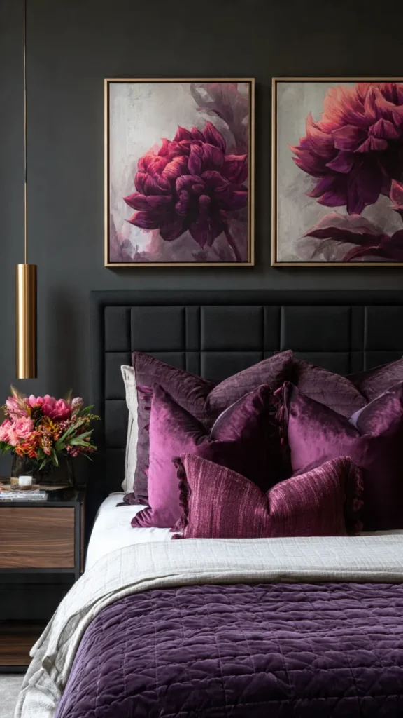 Purple velvet pillows or artwork add richness. These accents create visual intrigue without overwhelming the space. The depth feels intentional and curated.