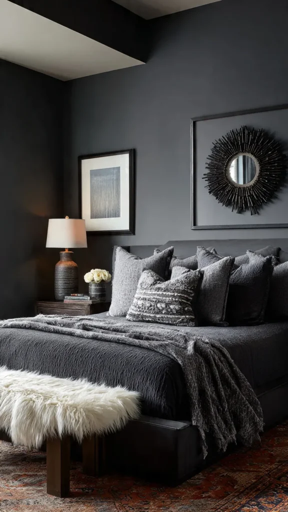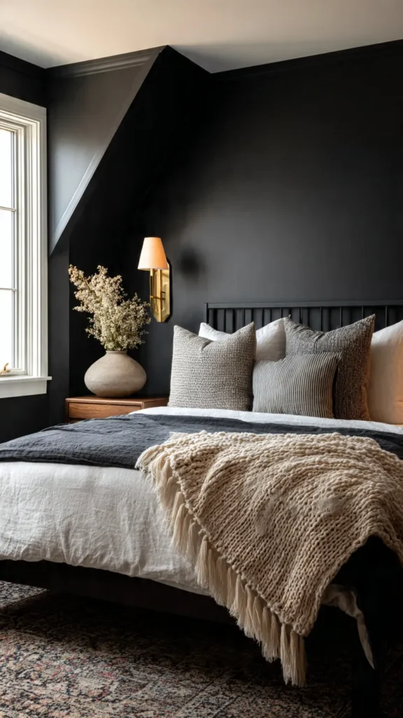 Charcoal bedding or curtains help soften black walls. This keeps the room visually interesting while maintaining cohesion. Texture becomes especially important in this color scheme.