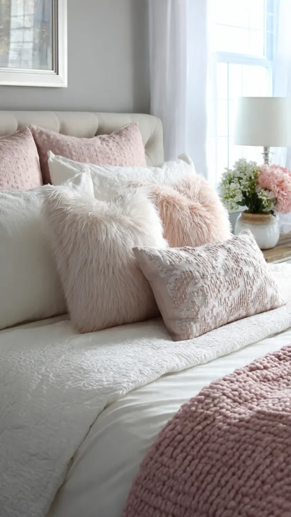 Blush bedding or accent pillows create gentle contrast. The color adds visual warmth while maintaining sophistication. It works especially well in bedrooms designed for relaxation.