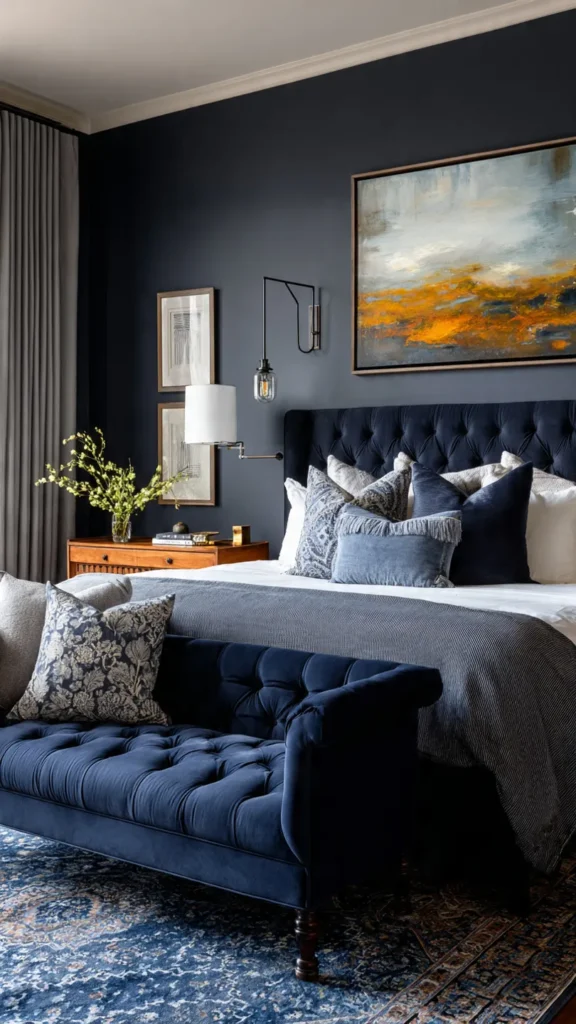 Navy and black create a deep, layered color story. Designers often use this pairing for tailored, moody bedrooms. The tones complement each other effortlessly.