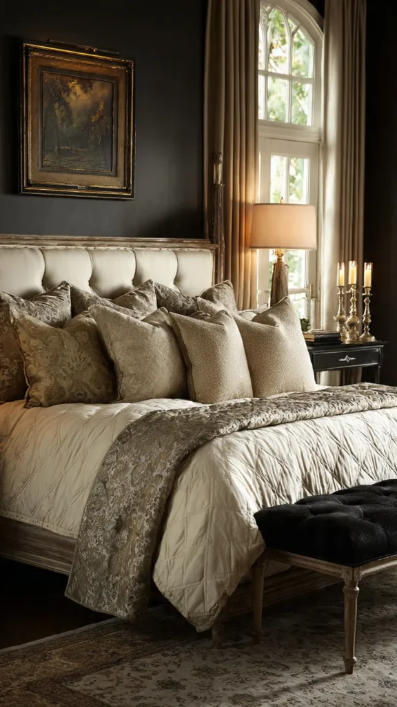 When used sparingly, brass keeps the bedroom refined rather than flashy. The contrast between matte black and warm metal feels intentional. This scheme is perfect for luxurious, designer-inspired spaces.