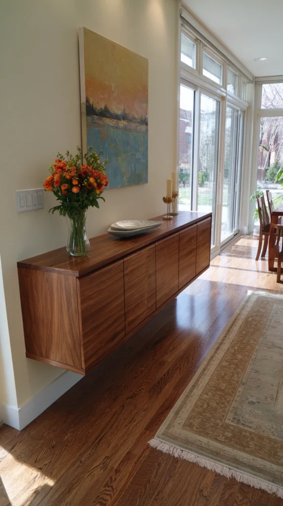 Mount a wall-hung credenza that floats above the floor, creating a light, contemporary look while providing enclosed storage that hides clutter. The floating installation makes the piece feel like architectural sculpture rather than furniture, and the space underneath keeps the room feeling open and uncluttered.