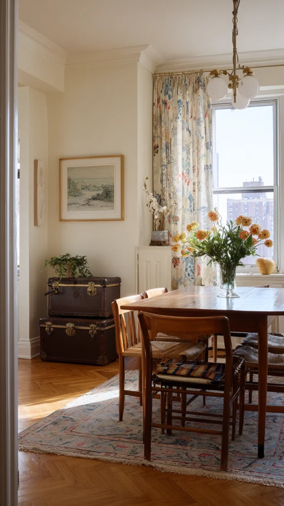 This approach works beautifully in eclectic, traditional, or bohemian dining rooms where the trunks’ character and history add to the room’s narrative.