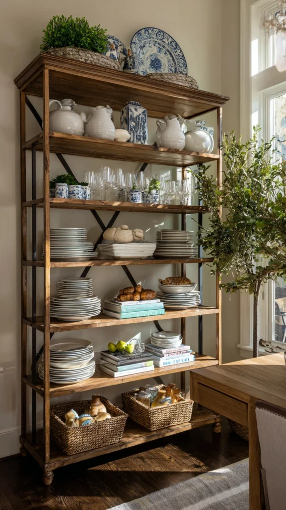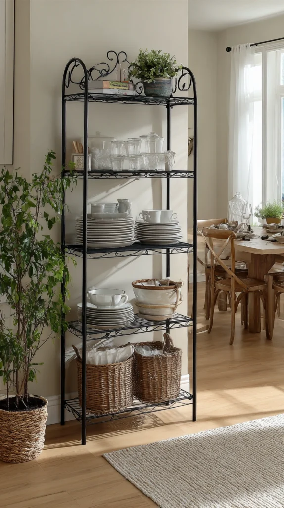 Position a baker’s rack—preferably in brass, iron, or wood—against a wall to store and display dishes, glassware, cookbooks, and plants. The open construction keeps the room feeling airy despite the storage capacity, and the vertical design draws eyes upward while occupying minimal floor space.