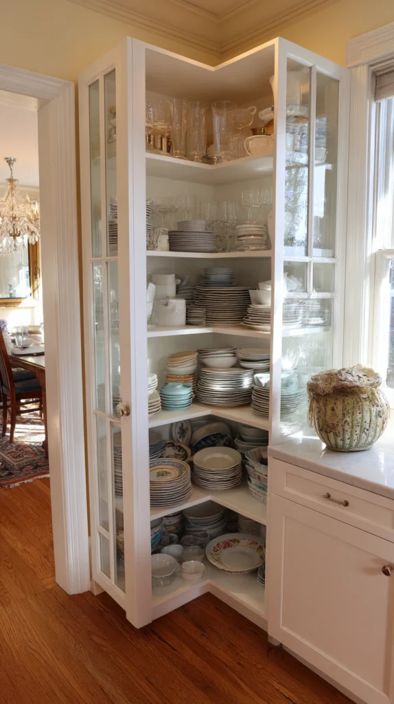Utilize corner space with a custom or antique corner cabinet that maximizes awkward areas while adding architectural charm. Corner cabinets often feature glass fronts that display beautiful dishes while their triangular footprint takes up minimal floor space.