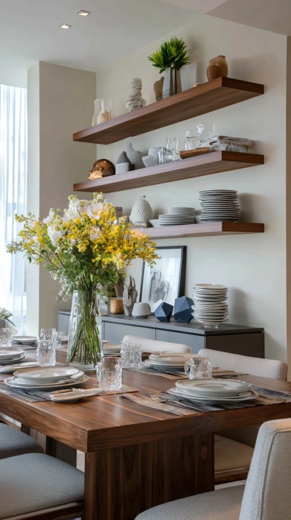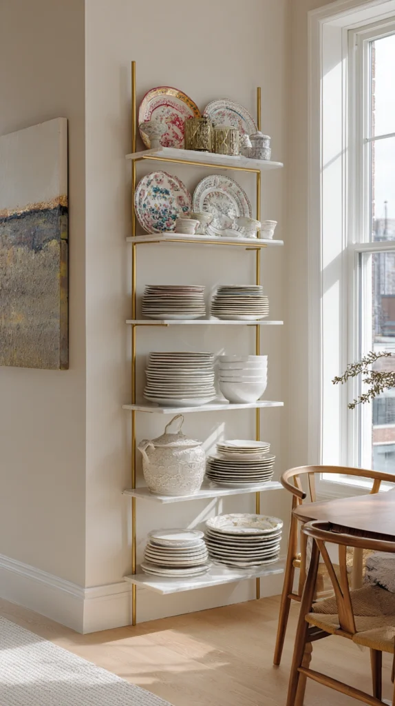 Install floating shelves in varying lengths arranged asymmetrically to create a modern gallery wall that stores dishes while functioning as sculptural art. Paint shelves the same color as walls for a built-in appearance, then display white dishes, beautiful glassware, and decorative objects with intentional spacing that prevents clutter.