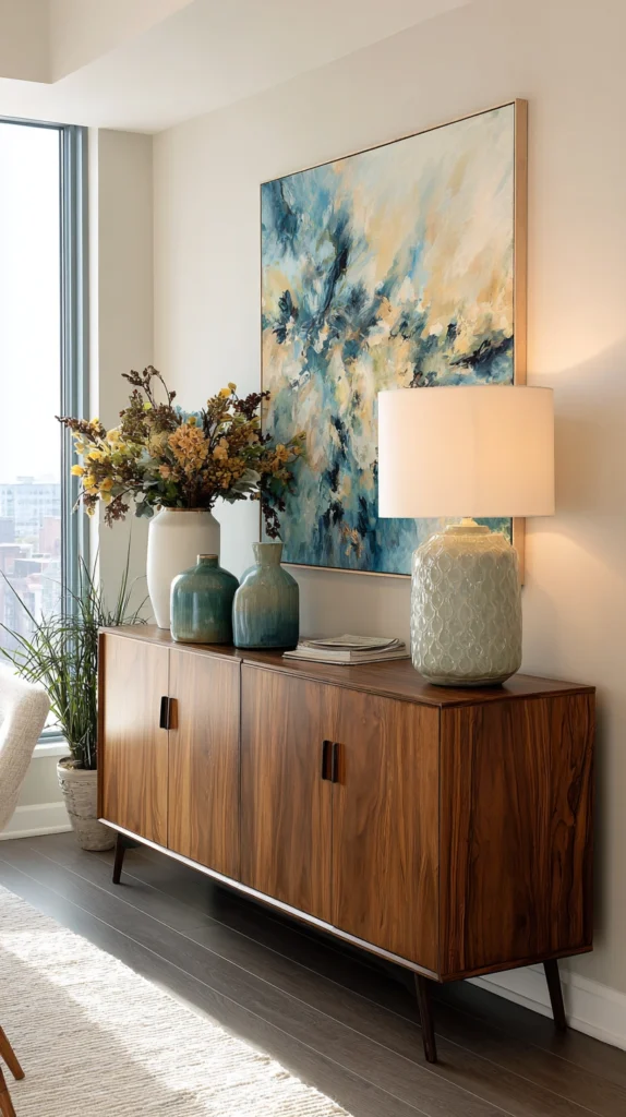 A low, long credenza or sideboard along one wall provides substantial storage without overwhelming the space visually. These pieces typically offer closed cabinet storage for less attractive items while their surfaces become display areas for lamps, artwork, plants, and decorative objects.